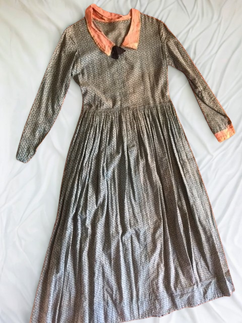 The dress reflects late 1930s daywear trends, combining practicality with modest decorative details. Its construction — simple seams, small collar, and gathered skirt — is consistent with home sewing practices of the period.