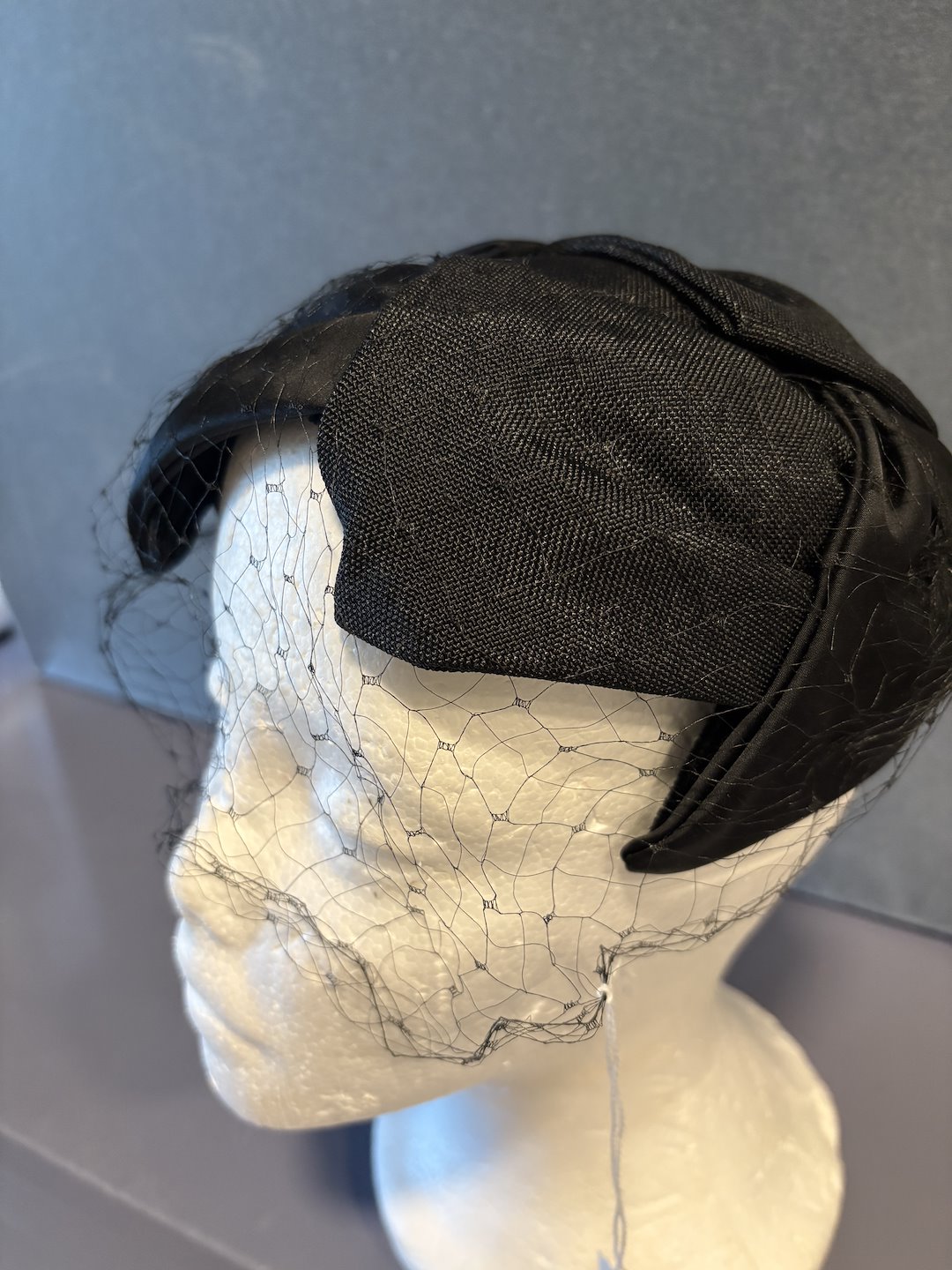 A classic mid-20th century pillbox or cap hat constructed from a structured, black fabric. The hat’s defining feature is the small face veil (birdcage veil), made of black netting, which is attached to the front brim and designed to drape mysteriously over the eyes and upper face. This style was an essential accessory for formal daywear, complementing the tailored suits and fitted coats of the period.